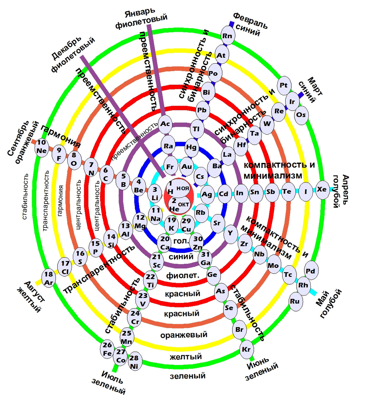 Месяца находят свое отражение в смене сезонов в Природе Земли, и соответственно в спектральных характеристиках, сопровождающих эту смену. На химической таблице отмечены месяцы, соответствующие спектру. 12 месяцев укладываются так: