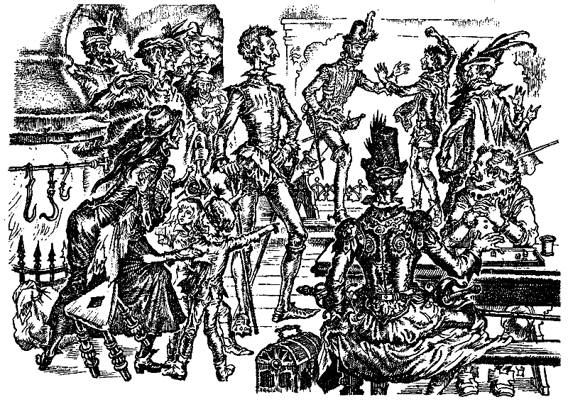 Рядом с этой странной личностью находился маленький человек, который, вскарабкавшись на пригорок, разговаривал с неким толстяком, еле сохранявшим равновесие на покатом склоне; чтобы не упасть, толстяк то и дело хватался за пуговицу на камзоле своего собеседника.