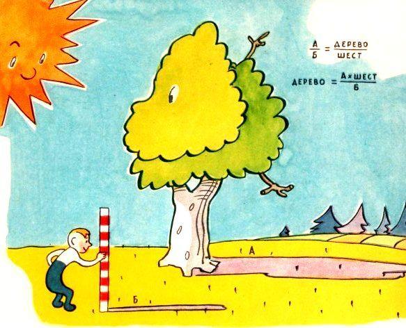 Что интересного можно найти в тенях, отбрасываемых предметами при сиянии солнца? С помощью теней, прежде всего, очень просто определить высоту одиноко стоящего дерева. В землю отвесно втыкают шест, измеряют его высоту и длину тени, а также длину тени, отбрасываемой деревом. Остаётся произвести расчёт по правилу: во сколько раз тень дерева длиннее тени шеста, во столько же раз дерево выше шеста.
