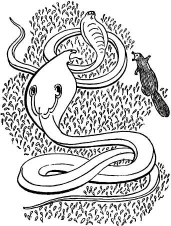 Дарзи и его жена юркнули в гнездо и ничего не ответили, потому что из густой травы, из-под куста, послышалось негромкое шипение — страшный, холодный звук, который заставил Рикки-Тикки отскочить назад на целых два фута. Потом из травы все выше и выше, вершок за вершком, стала подниматься голова Нага, огромной черной кобры [3] , - и был этот Наг пяти футов длины от головы до хвоста.